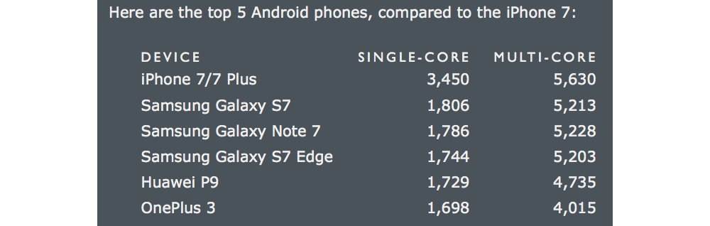 除了和智能手機的競爭對手進(jìn)行比較之外,Gruber 還將 iPhone 7 和 MacBook Air 以及 2013 年款的 MacBook Pro 進(jìn)行對比。以往進(jìn)行這樣的對比是完全沒有意義的,因為 Geekbench 并沒有提供移動設(shè)備和桌面設(shè)備之間的跑分。但經(jīng)過 Geekbench 的努力,現(xiàn)在終于讓我們有理由對移動設(shè)備和桌面設(shè)備進(jìn)行對比了。